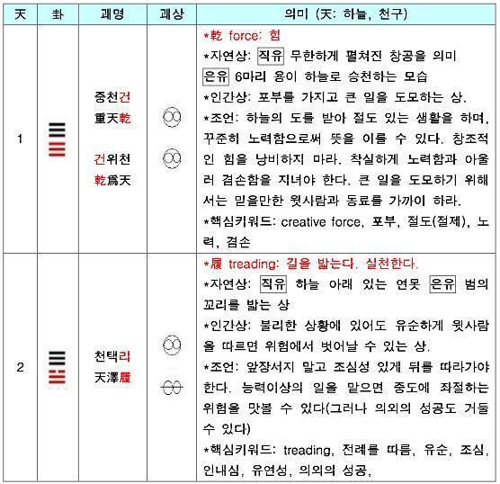 예를 들어 天澤履의 경우 앞의 두 글자 天과 澤은 상괘와 하괘의 이름이고,