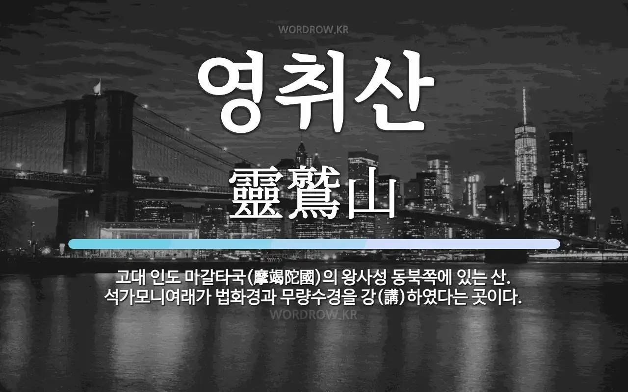 * 영취산(靈鷲山):고대 인도 마갈타국(摩竭陀國)의 왕사성 동북쪽에 있는 산. 부처가 법화경과 무량수경을 강(講)했다는 곳이다. 영축산이라고도 하는데 우리나라에도 경남 양산 등에 이 이름을 가진 산이 있다.