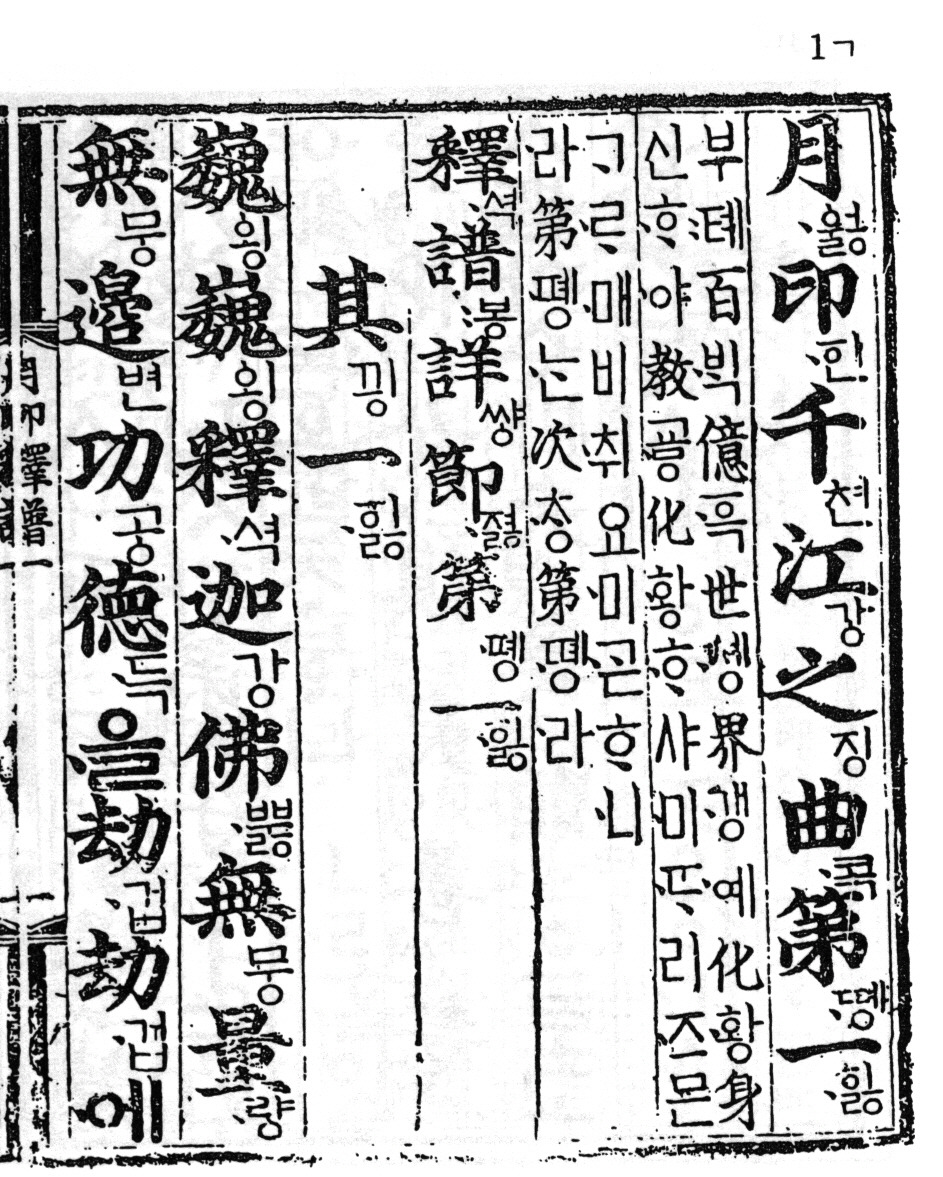 月印千江之曲. 제목을 해석하면 '달이 즈믄[1] 가람에 비치는 노래'이다.