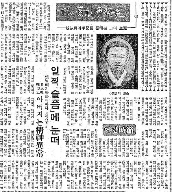 더 자세한 김소월 스토리는 숙모 계희영(당시 75세)씨가 쓴 수기(手記)다. 조선일보가 입수해 1965년 9월 26일부터 10월 10일까지 3회 연재했다. 어린 시절(1회), 여인 관계(2회), 번민의 시절(3회)로 이어졌다. 기사는 “현재 서울에는 소월의 3남 정호(33·강생회)씨와 소월의 사촌 및 그 가족들이 산다”고 했다.