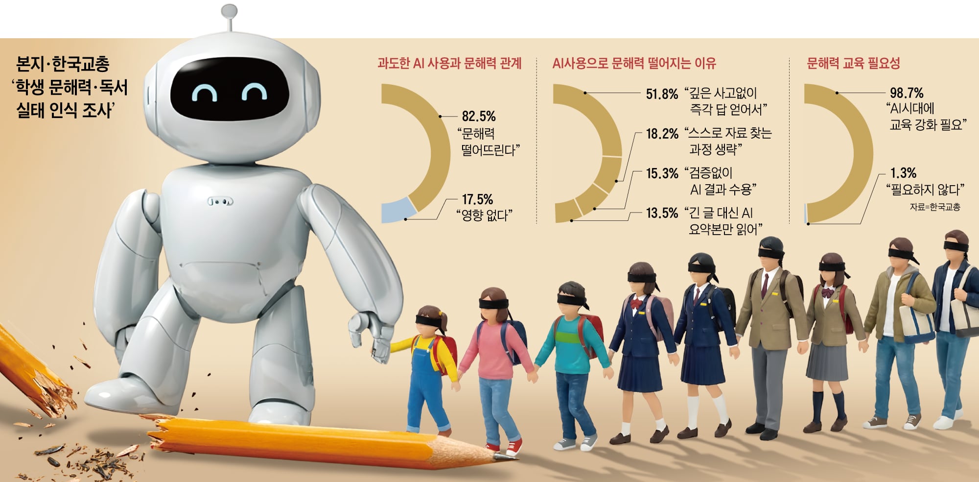 교육 현장 깊숙이 AI(인공지능)가 들어오면서 AI의 정보에 대한 판단 능력이 중요해졌지만, 학교 현장에선 “AI를 맹신하는 문제가 심각하다”는 우려가 쏟아진다. 본지가 한국교총과 함께 전국 초·중·고 교사 941명을 대상으로 진행한 설문조사에서 응답자의 82.5%가 “과도한 AI 사용이 학생의 문해력을 떨어뜨린다”고 답했다. AI 사용이 문해력을 저하시키는 이유에 대해선 가장 많은 51.8%가 “깊이 있는 사고 과정을 건너뛰고 즉각 답을 얻기 때문”이라고 했다. ‘스스로 자료 찾는 과정 생략’(18.2%), ‘AI 결과를 검증 없이 수용’(15.3%) 등도 문제로 지적됐다.