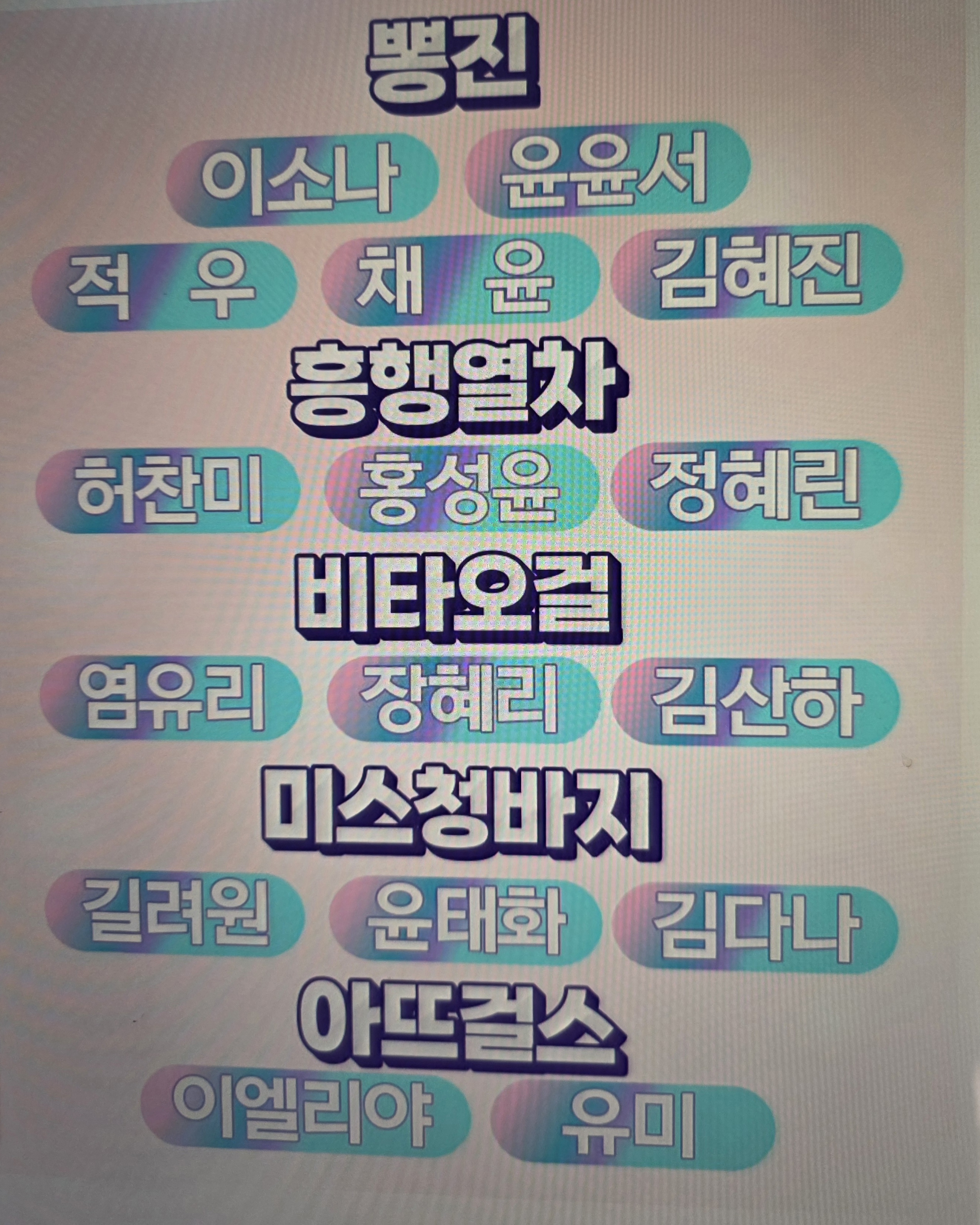 | 허찬미 | 윤태화 | 염유리 | 길려원 | 이소나 | 2주차 |