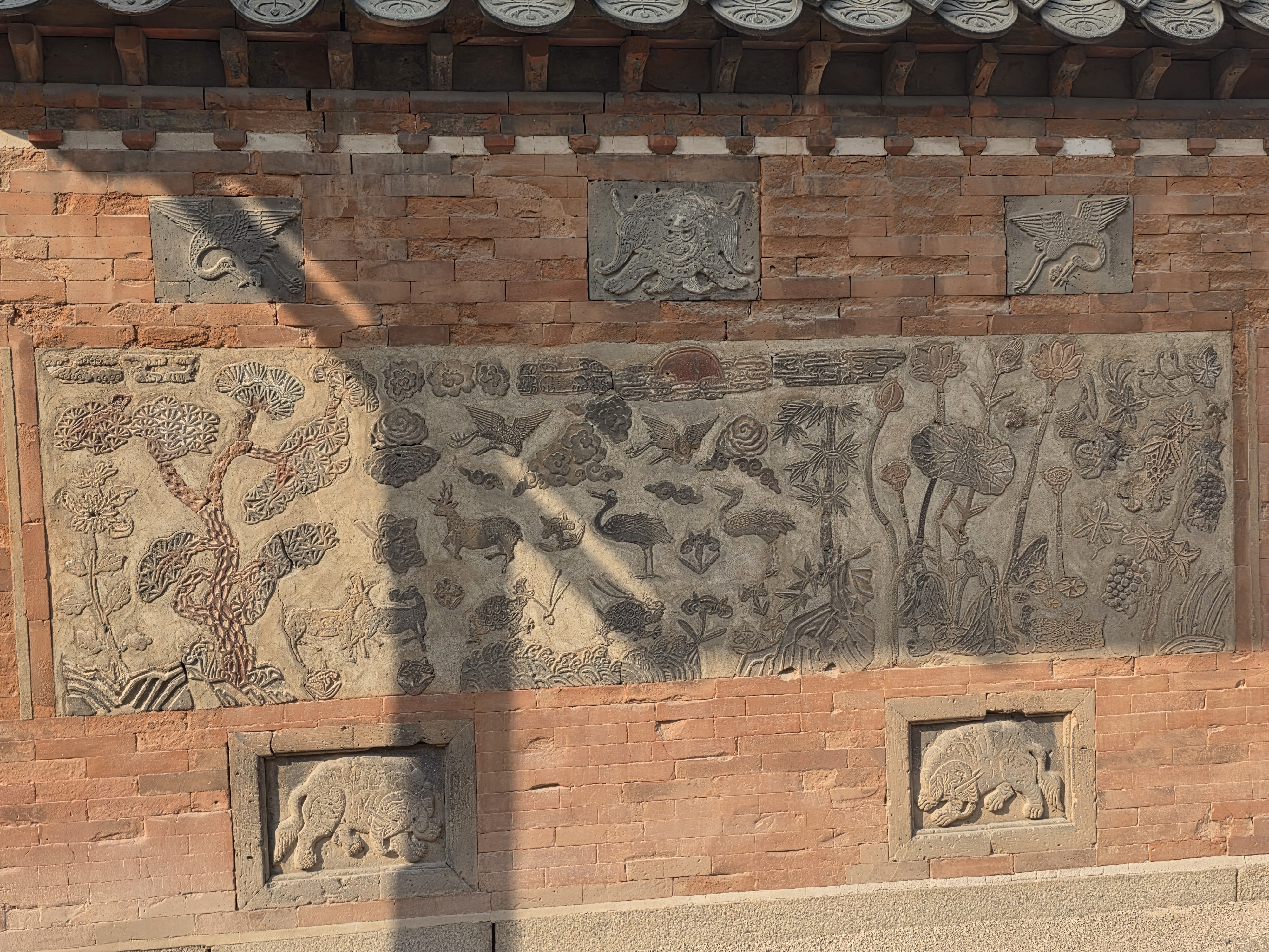 벽면의 크기는 너비 381㎝, 높이 236㎝, 두께 65㎝이다. 제일 아랫부분에는 좌우에 각각 벽사상(辟邪像)을 전(塼)으로 만들어 배치하였다. 그 위로(중앙부) 가로 303㎝, 세로 88㎝의 장방형 공간을 구획하였다. 불로장생을 상징하는 해·산·구름·바위·소나무·대나무·거북·사슴·학·연꽃·불로초 등을 제각기 다른 조형전(造形塼)으로 만들어 회벽에 화면을 구성하였다.